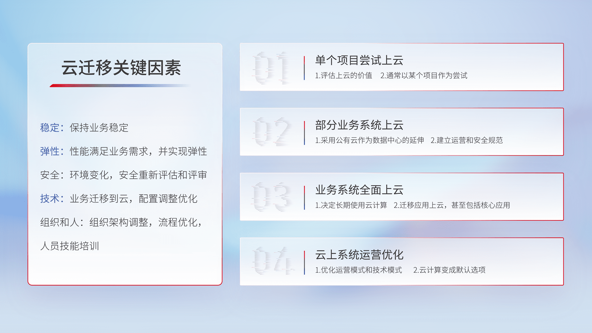 结合实际业务,,,从规划设计、、、、云平台选型、、、、云原生改造、、、、数据迁移、、集成交付,,,迁移全过程为客户识别最佳上云路径,,,做好风险识别管理,,,,设计网络架构、、身份权限、、、、安全审计合规、、、、操作审计、、日志审计、、监控告警策略、、、、多站点容灾设计等,,对云上基础设施进行整体规划,,提升IT治理水平,,,,以满足弹性、、、、高可用、、、、高性能的需求。。