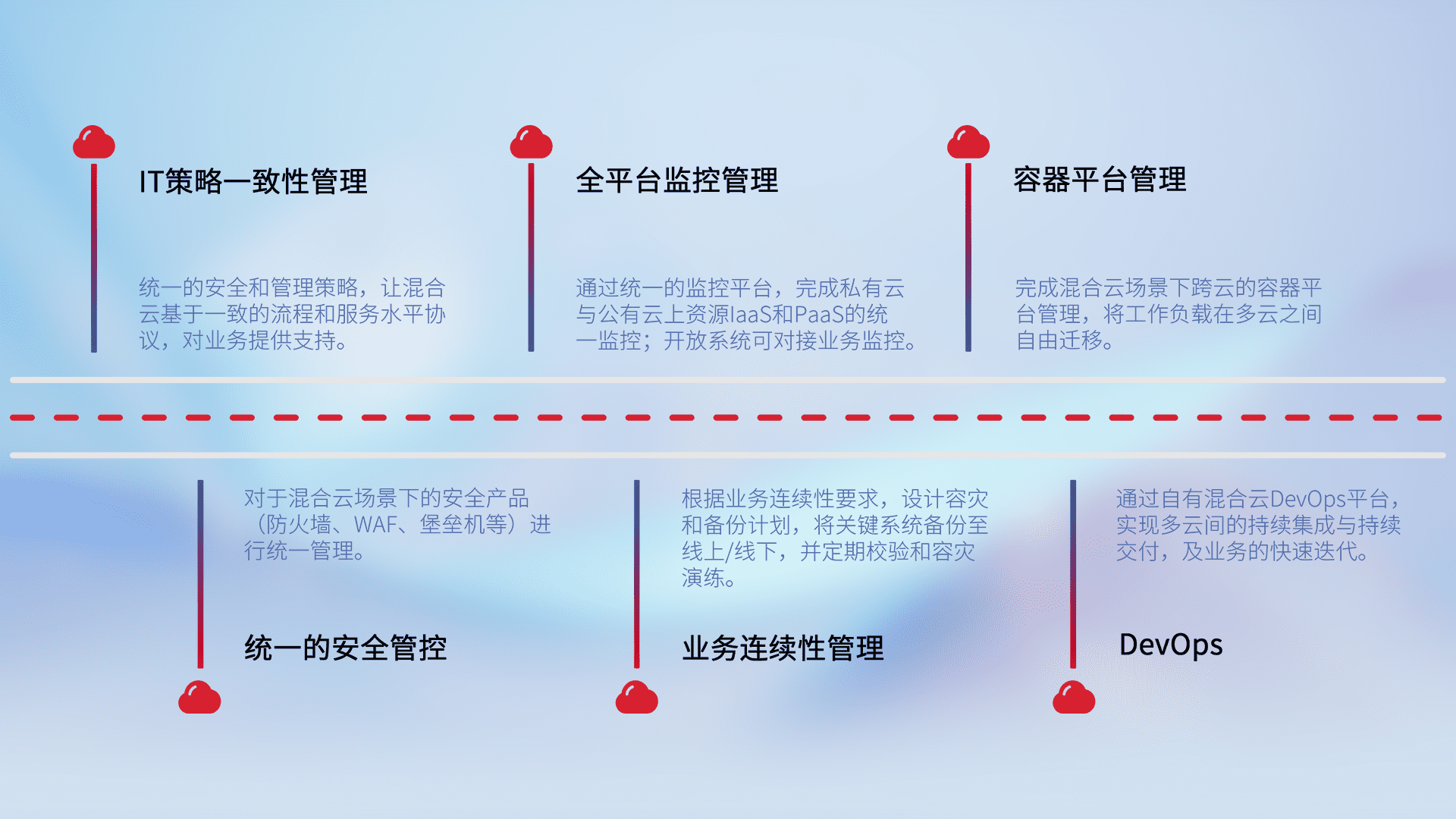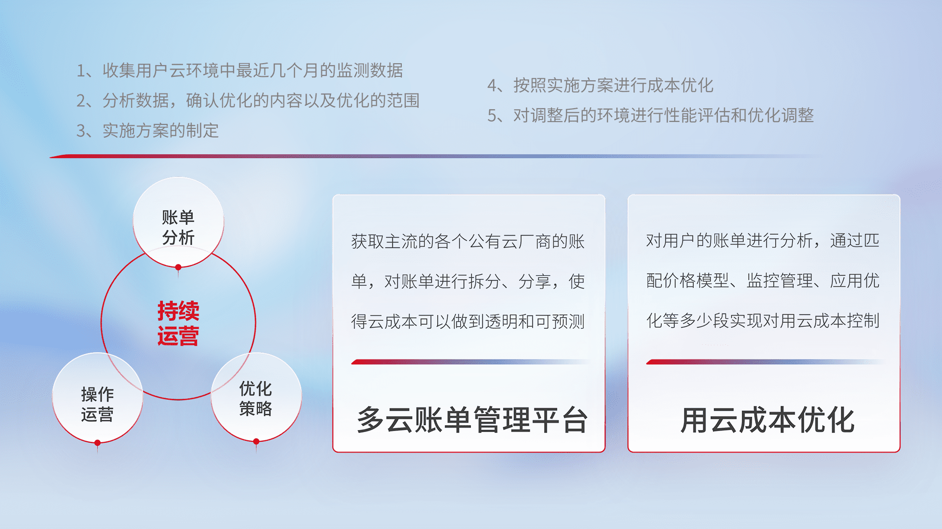 通过多云纳管,,以统一的资源数据模型把客户的云资源进行抽象和封装,,进而实现对多云资源的统一操作,,,,保障云资源管理的可靠性、、稳定性与可用性。。量身定制化运维内容,,,配置、、、开发运维、、、补丁管理、、备份、、、监控、、认证和访问管理、、审计和日常巡检等,,,保障在用云过程中的可靠度,,,,稳定度以及高可用率。。。